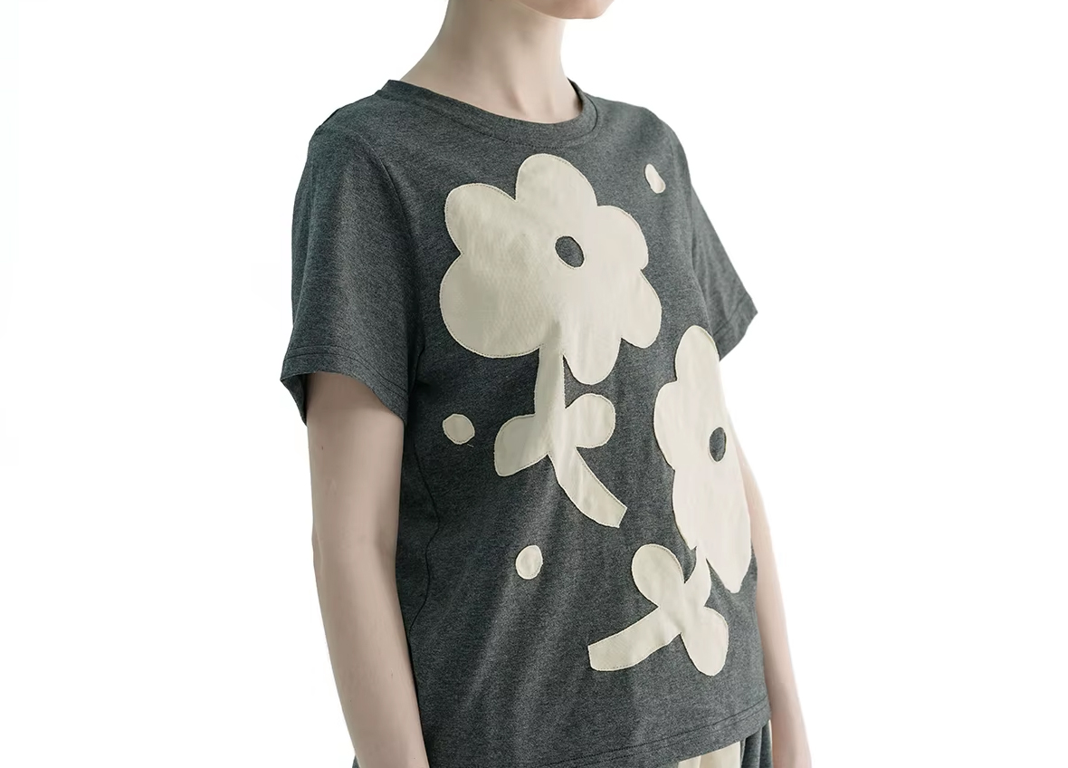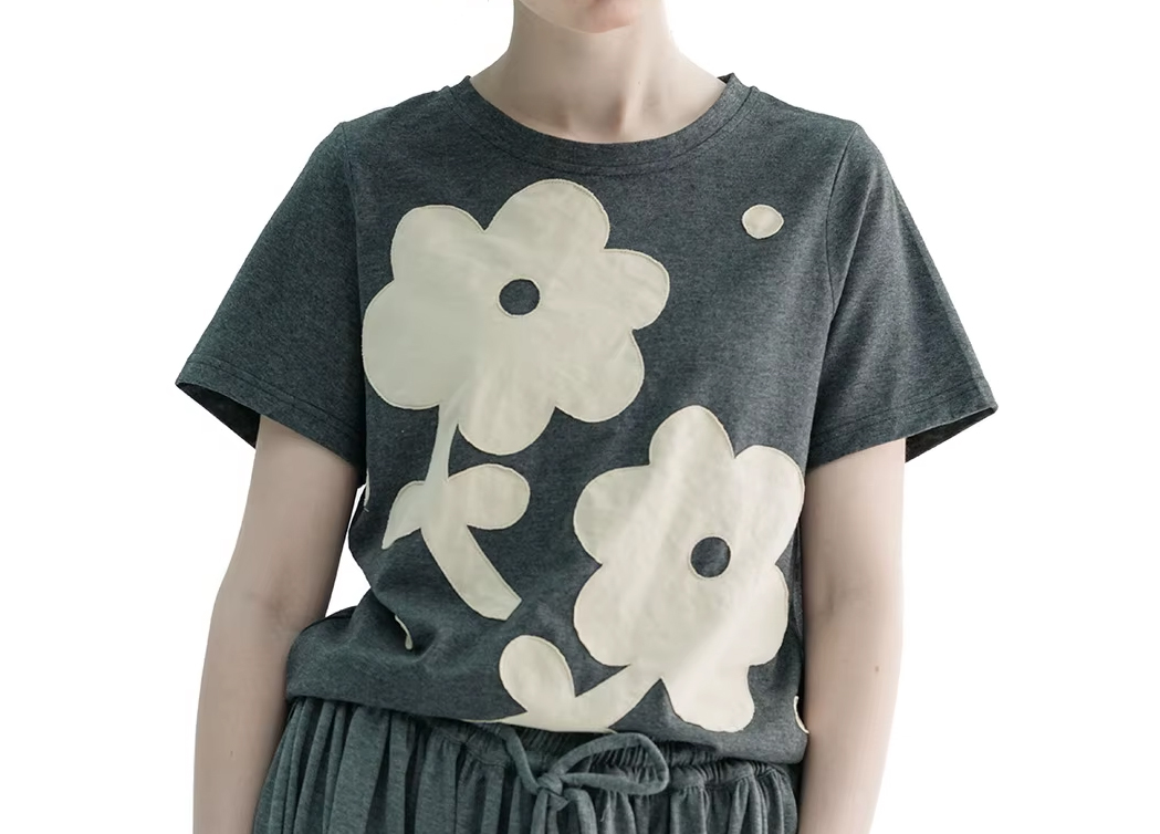 חולצה אפורה עם פרחי בד לבנים רקומים בקפידה.